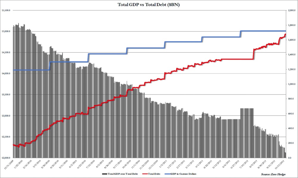 De directe oorzaak om het over schuld te hebben was de publicatie van de wereld schuldklok van The Economist. Hieronder staat een screenshot van de pagina, waarbij je niet alleen de totale schuld van de wereld ziet, maar ook per land kan inzoomen en bovendien terug in de tijd kunt gaan om te zien hoe goed het leven was in ???zeg- 2002. Als je nu naar die site zou gaan vallen er twee dingen op. Ten eerste hoe snel de teller momenteel oploopt. Ik heb deze screenshot een week geleden gemaakt en sinds die tijd is er al weer een luttele 45 miljard aan nieuwe schuld uitgegeven. Fictief, want hoewel de klok gelijkmatig oploopt, loopt schuld uiteraard schoksgewijs op: het is slechts een schatting van de echte schuld. Een tweede punt dat de oplettende lezer zal opvallen bij deze schuldklok is de schuld die bij Amerika staat. Niet de 14,3 biljoen dollar die onlangs nog als keihard schuldplafond gold, maar op 8,9 biljoen dollar. Hebben we niet opgelet en heeft de VS haar schuld onverwacht terug weten te brengen? Nee, helaas: ook de Amerikaanse schuld is gewoon verder opgelopen en bedraagt momenteel zelfs al 14,9 biljoen dollar… Wat blijkt echter, er zijn twee maatstaven voor Amerikaanse schuld in omloop. De 14,9 biljoen dollar is de bruto schuld uitgegeven door de Federale overheid. Een deel van deze schuld is echter gekocht door diezelfde federale overheid (als onderdeel van de sociale verzekeringen) en wordt dus door sommige weggestreept. The Economist kiest bijvoorbeeld voor wegstrepen en kijkt dus naar de 'publieke schuld', maar het IMF houdt zich keurig aan de 14,9 biljoen dollar. Als je die 14,9 biljoen hanteert en die naast de omvang van het nominale BBP van 15 biljoen dollar legt, roept dat uiteraard de vraag op wanneer de Amerikaanse even groot zal zijn als de omvang van het BBP. Volgens deze grafiek zal dat heel binnenkort te zijn. Op Halloween, om precies te zijn… Schuldklokken of the world, unite!