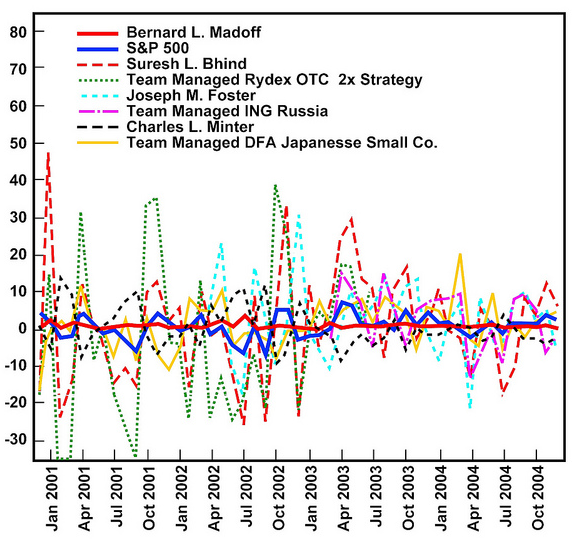 Geen mooie grafiek, maar de boodschap is wel erg duidelijk. Man: wat was die Madoff stabiel!