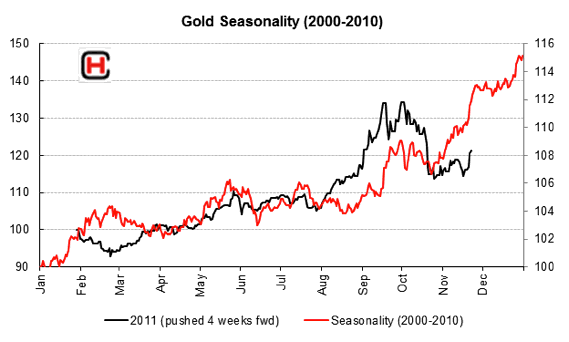 Morgen allen. Goud en het (10 jaars) seizoenseffect. Maar waarom is die zwarte lijn 4 weken naar voren geduwd…?