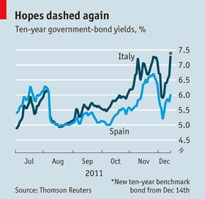En deze blijft maar rondzingen, zelfs bij The Economist: de 10 jaars rente van Itali?? zou weer (stevig) boven de 7% handelen. Alleen is Bloomberg het er niet mee eens…