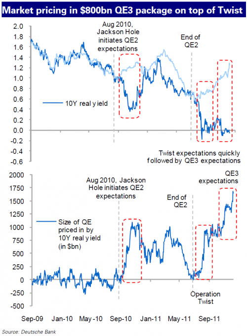 Ik krijg het gevoel dat hier een paar analisten in overdrive zijn gegaan; ze gebruiken de afwijking van hun schattingsmodel als proxy om de ingeprijsde QE3 te berekenen. Het kan uiteraard ook zijn dat je model niet klopt…