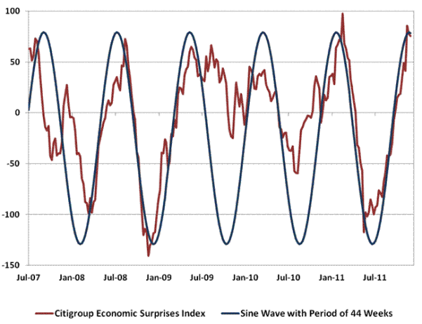 Morgen allen. De Amerikaanse surprise index en een sinusgolf. Volgens Hussmen zegt het allemaal niets: analyst tend to be all or nothing.
