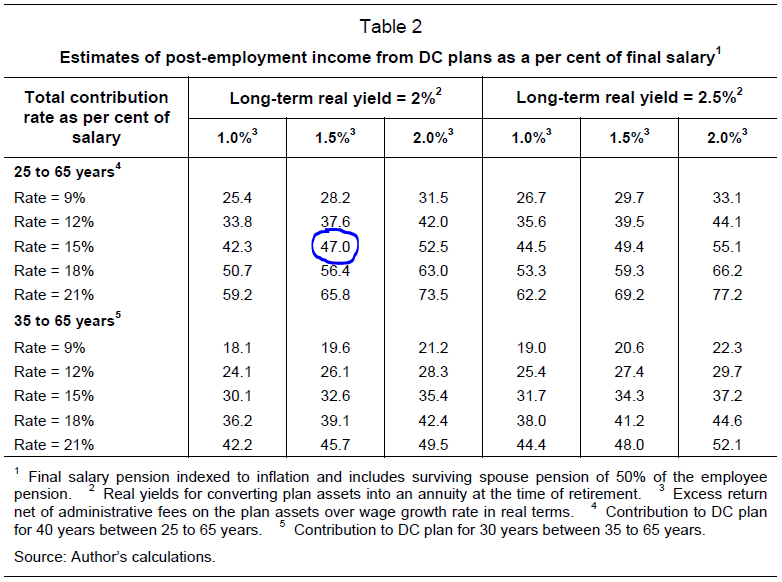 De BIS over ‘The sustainability of pension schemes’. Ter verduidelijking: als je 40 jaar lang 15% van je loon bijdraagt 1.5% excess return maakt, dan is je pensioeninkomen 47% van je laatste loon…