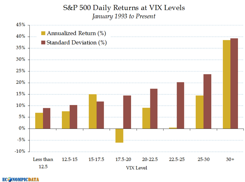 Interessant verband tussen de hoogte van de VIX en rendementen in aandelen. Als de VIX tussen de 17.5% en 25% staat leveren aandelen een slechte risk/return…De Euclidische afstand. Ik laat hem nog even inzinken…