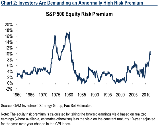Extreem hoge risk premium voor aandelen. Of een extreem lage kapitaalmarktrente, uiteraard…