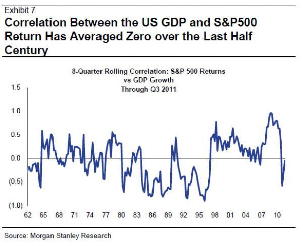 Deze vind ik ook mooi: de correlatie tussen BBP-groei en de S&P