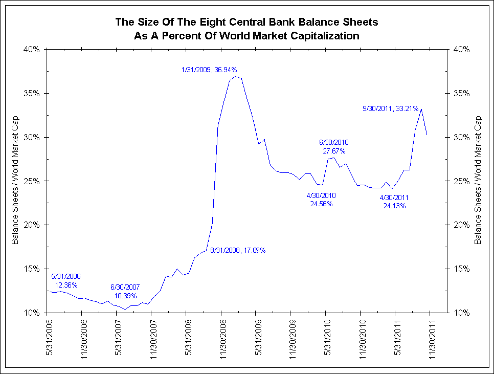 Een hele serie van grafieken over de balansen van centrale banken, wat resulteert in deze laatste grafiek. Jammer dat hij niet verder terug gaat in de tijd…