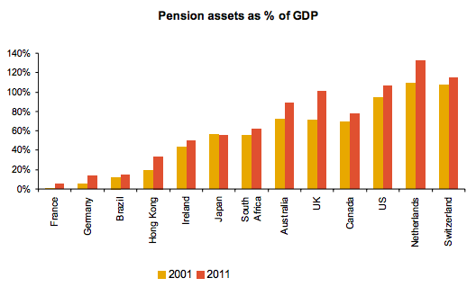 Een studie van Tower Watson over de ontwikkeling van pensioentegoeden in de wereld. Veel tabellen en grafieken, zoals deze. Waarom Nederland achter Zwitserland staat is mij alleen niet duidelijk…