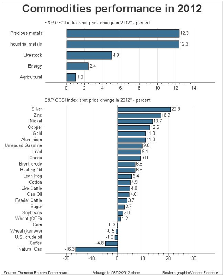 Interessant overzicht van de performance van grondstoffen in 2012: metals zijn de winnaars tot nu toe
