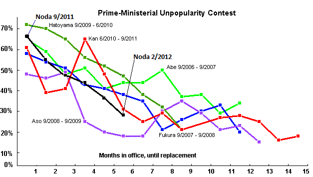 Deze heb ik al een keer eerder laten zien, maar blijft veelzeggend: populariteit van de 6 Japanse premiers. Noda doet het niet veel beter dan zijn voorgangers