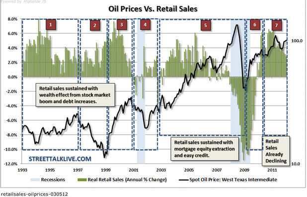 Intrigerende poging om detailhandelsverkopen en de prijs van olie in een allesverklarende grafiek te plaatsen. De tekst erbij helpt toch ook nog een beetje…