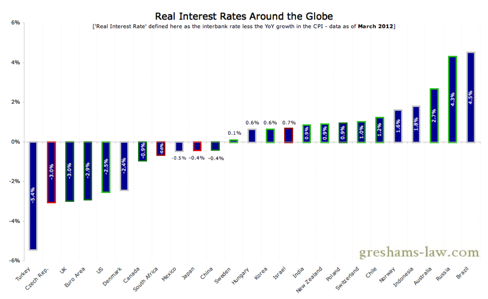 Handig overzicht van reele rente niveaus wereldwijd, maar de koppeling met Gresham’s Law gaat mij wat ver…