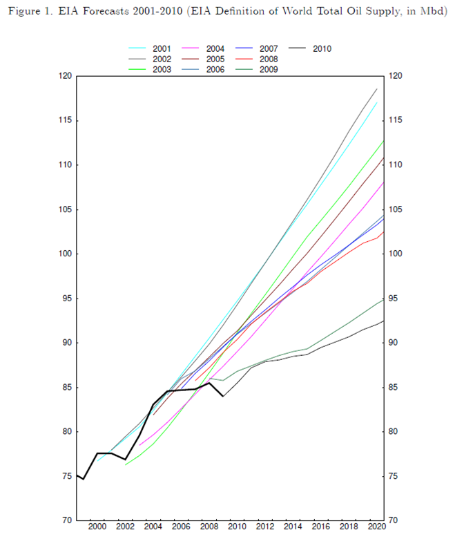 Mooie, zij het wat saai uitgevoerde, afbeelding van hoe de EIA steevast te positief is over het aanbod van olie… (via @hansdegeus)