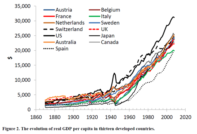 Een studie naar de lange termijn groeivoet van het reële BBP per capita. Helemaal vallen doet het kwartje nog niet, maar alleen al vanwege de historie (1870) de moeite waard