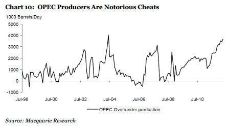 Mooie grafiek die laat zien hoeveel er teveel geproduceerd wordt boven afgesproken target door OPEC landen