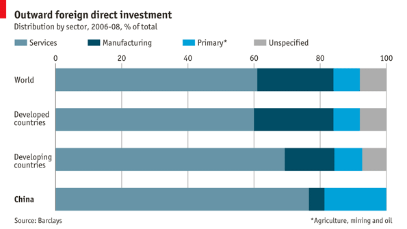 Often a very nice source of interesting charts: the Economist. China mostly invests in the service industry