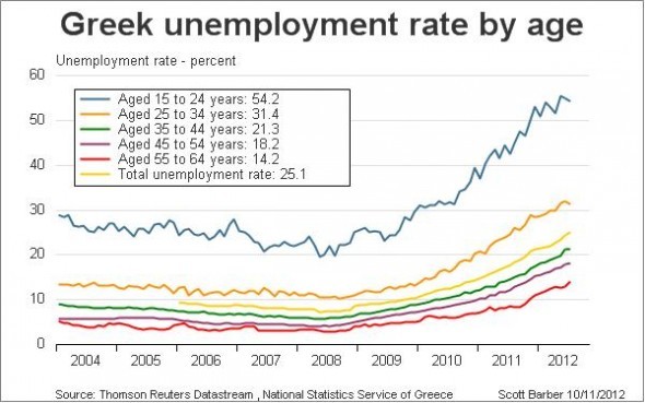 Greek unemployment hits a new record high: 1 in 4 unemployed. Some additional info