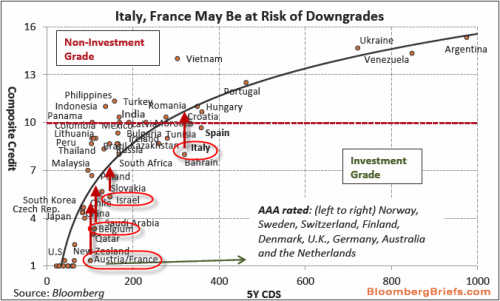 According to the CDS markets Italy, France and Belgium are up for a downgrade. Or, on a more positive note, Vietnam is up for an upgrade???