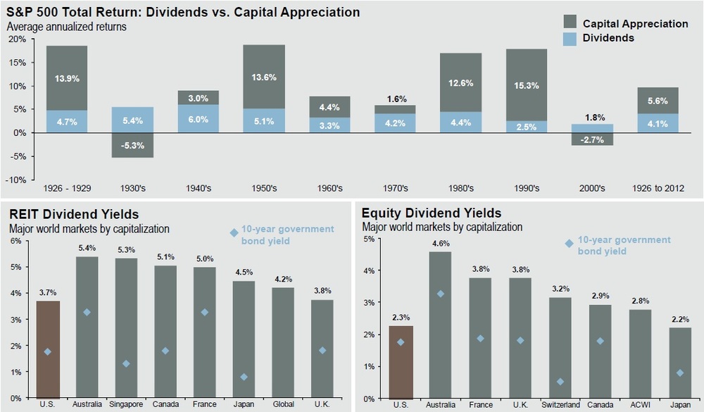 Stable dividend income has helped stock returns in the past, but the US has pretty low dividend yields in international comparison