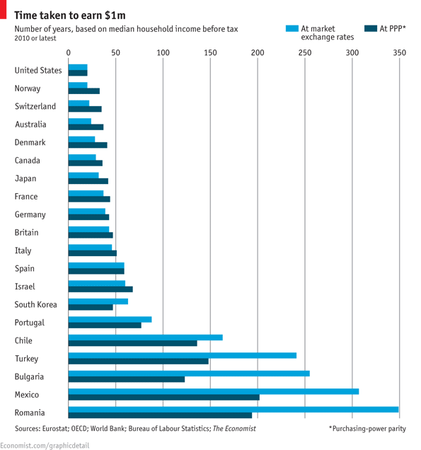 Nice: it takes the median Romanian 350 years of work to earn 1 million USD. Without paying taxes that is