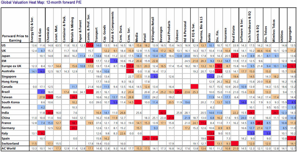 Overview table showing the valuation of equities according the 12 months forward PE. I don???t understand why certain blanks are red???