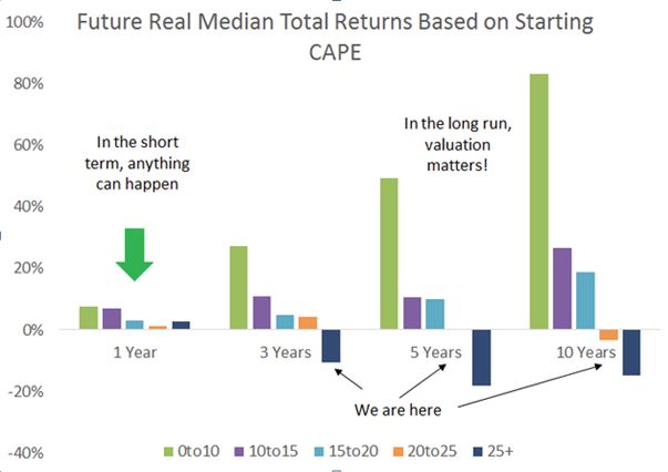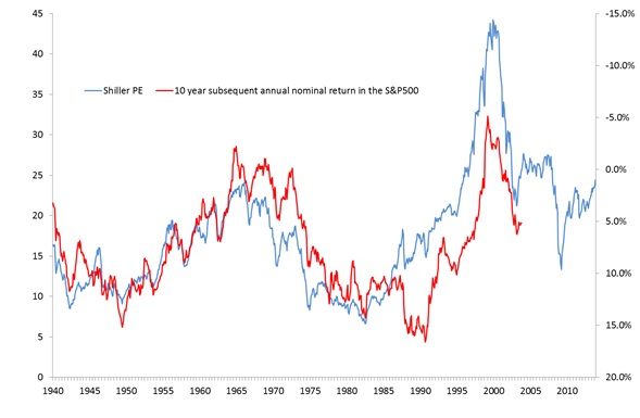 In this chart, the blue line represents the Shiller P/E, while the red line shows the nominal annual returns you would have made in the subsequent 10 years. The red line is basically forward looking, which also explains why it only runs until 2003 (which represents the return for the period 2003-2013).Also, note that the axis for the red line is inverted: the higher it goes, the poorer the return. The message is pretty simple: the more expensive stocks are (blue line rising), the lower the returns of the next ten years will turn out to be. And with blue going up, red is soon to follow, the argument goes.