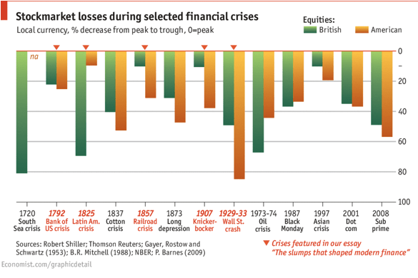 Na de euro-crisis, de huizen zeepbel in de VS en de dotcom, zijn we de afgelopen 15 jaar redelijk ‘verwend’ als we het over financiële crises hebben.Dit overzicht van The Economist maakt het beeld completer.