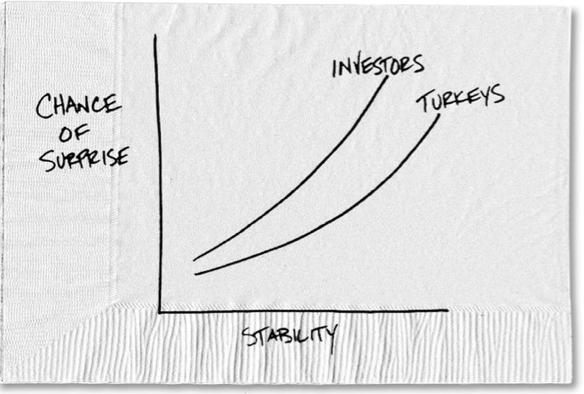 Het verhaal van de kalkoen staat in Taleb’s Black Swans, maar aangezien ik die nu niet even onder handbereik heb, geef ik hier de versie die ik me er van kan herinneren. Een kalkoen wordt geboren en zit in een hok. Op een goed moment komt er een man binnen. De kalkoen weet nog van niets, dus wacht vol spanning af wat de man komt doen. De man geeft eten en vertrekt. Kalkoen blij. Dag twee: man komt binnen, kalkoen kijkt het weer aan en krijgt wederom eten. Kalkoen blij. Dag drie, idem.