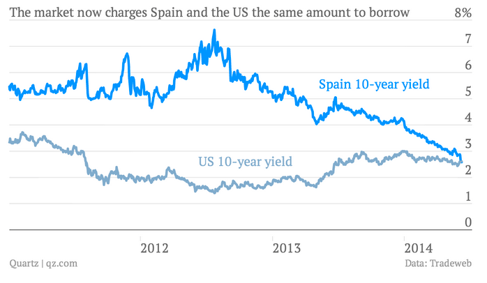 http://qz.com/218639/spanish-bond-yields-have-dropped-below-those-on-us-treasurys-but-it-doesnt-mean-theyre-safer/
