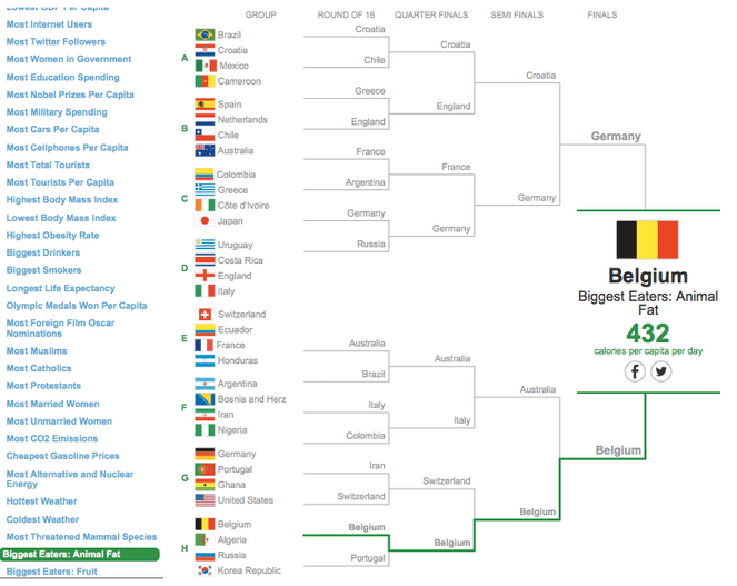Maar mijn favoriet is de functie die de Wall Street Journal heeft gemaakt, vooral omdat hij dus juist niet over voetbal gaat (Met dank trouwens aan @went1955, die me op deze link wees.). Weliswaar wordt het speelschema van de voetbalkampioenschappen als startpunt gehanteerd, maar in plaats van voetbal, kijk je naar… het percentage katholieken per land Of vliegvelden per hoofd van de bevolking! Of wat te denken van de consumptie van dierlijk vet!