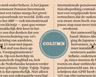 Niets is minder waar. Met maar liefst $ 1.260 miljard onder beheer, is het Japanse Government Pension Investment Fund met een ruime marge het grootste pensioenfonds ter wereld. Zelfs een reus als het ABP – ook internationaal echt geen kleintje – past qua vermogen makkelijk drie keer in het GPIF. Je zou dus denken dat een allocatieverschuiving van 10% in de richting van aandelen, waarvan 5% naar niet-Japanse aandelen wel wat stof zou doen opwaaien… Voorpaginanieuws? Niet dus. Op een berichtje in het Financieele Dagblad na, heb ik er in de Nederlandse kranten verder niets over gelezen. Tsjirp. Tsjirp. Tsjirp.