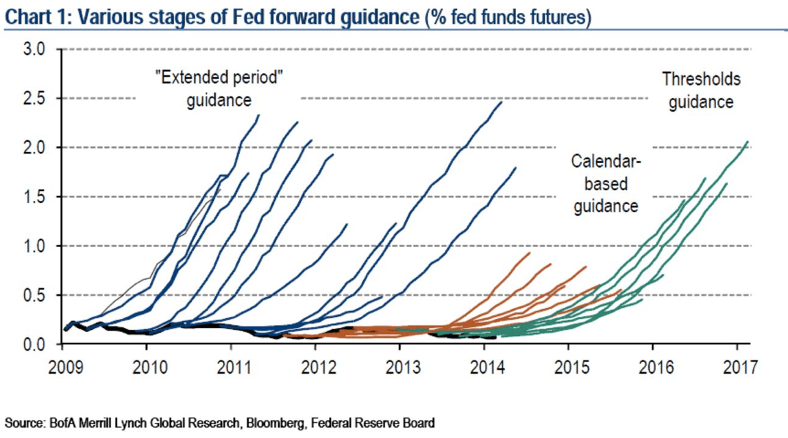 Over twee dagen wordt het mooi weer: dat was waar ik aan moest denken toen ik bovenstaande grafiek zag. In deze grafiek gaat het alleen niet om de zon, maar om het moment waarop de Federal Reserve (de centrale bank van de VS) de rente zal gaan verhogen. Hierbij zijn er twee soorten lijnen.