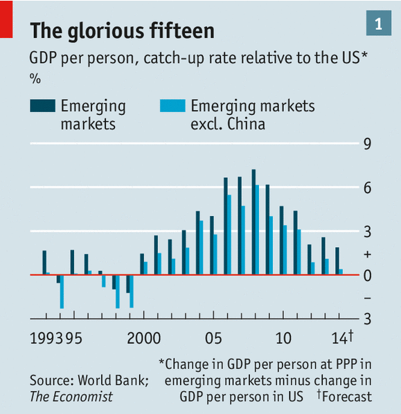 Kom ik terug op die eerste opmerking: waren opkomende landen niet die groep landen die altijd meer groeide dan de rest van de wereld? Bovenstaande grafiek laat zien dat het niet vreemd is dat je dat wellicht denkt, aangezien opkomende landen sinds 2000 steevast veel betere groeiresultaten heeft laten zien dan het Westen. Hierbij is in de grafiek van The Economist specifiek gekeken naar het groeiverschil ten opzichte van de VS. Al bijna vijftien jaar is er sprake van stabiele, hoge groei, die duidelijk boven die van het Westen ligt.