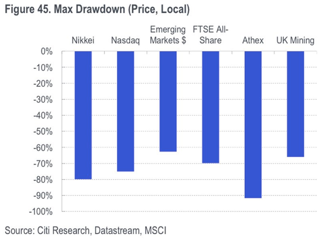 Maar we kunnen het nog een stapje erger maken, uiteraard. Bovenstaande grafiek geeft het maximale verlies van relatief brede aandelenindices weer, maar als je naar specifieke aandelen kijkt, lopen de maximale verliezen nog wat verder op. Voor zes spraakmakende aandelen zien die maximale verliezen er als volgt uit, gerangschikt naar maximaal verlies: