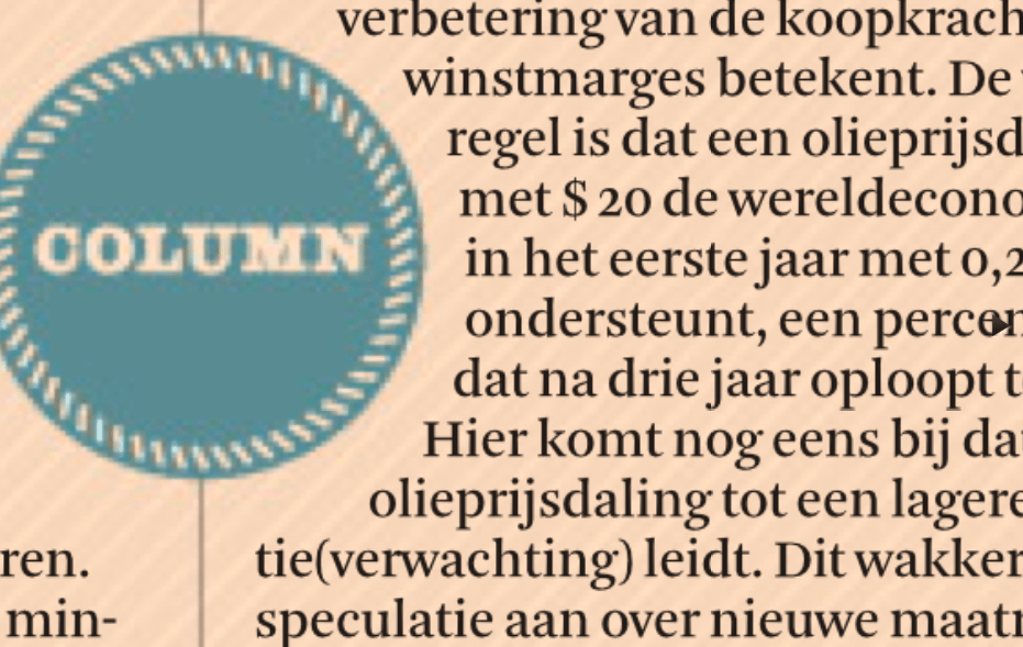 Inmiddels is het Grote Terugblik Seizoen in alle hevigheid losgebarsten en spant het erom of mijn uitspraak stand houdt. Dat de Duitse kapitaalmarktrente sinds dat marktcommentaar nog eens gehalveerd is en tijdelijk zelfs even onder de 0,7% is gezakt, sterkt mij in mijn oorspronkelijke keuze. Echter, wie de krantenkoppen van de afgelopen weken een beetje in de gaten gehouden heeft, weet dat zich een serieuze uitdager heeft aangediend: de daling, nee, de ineenstorting van de olieprijzen. Gerekend vanaf de piek in juni daalde de prijs van een vat olie de afgelopen zes maanden met een krappe 40%. Een dergelijke daling hebben we uiteraard wel vaker gezien, maar dan meestal ten tijde van wereldrecessies of aan het einde van een militair conflict in het Midden-Oosten. Nog nooit zomaar tijdens 2014, zeg maar.