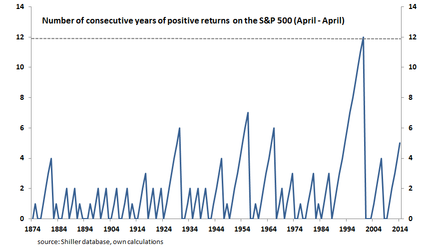 It’s a chart taken from a presentation by Jeffrey Gundlach, the founder of DoubleLine Capital. Its shows that the current string of uninterrupted years with the S&P500 ending the year higher has reached six, which is the record only reached once before in the 1898-1903 period. This looks ominous for the stock market in 2015, especially if we focus on that “-18% price correction!” tag in the chart.