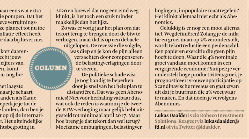 Gelukkig is er nog een mooi alternatief. Wegdefiniëren! Zolang je de inflatie en groei maar op 2% veronderstelt, wordt tekortreductie een peulenschil. Een papieren exercitie die geen pijn hoeft te doen. Waar die 4% nominale groei vandaan moet komen in een vergrijzende economie? Simpel: je veronderstelt hoge productiviteitsgroei, je prognosticeert vrouwenparticipatie op Scandinavische niveaus en gaat er vanuit dat je buurman die 2% weet waar te maken. En dat noem je vervolgens Abenomics.