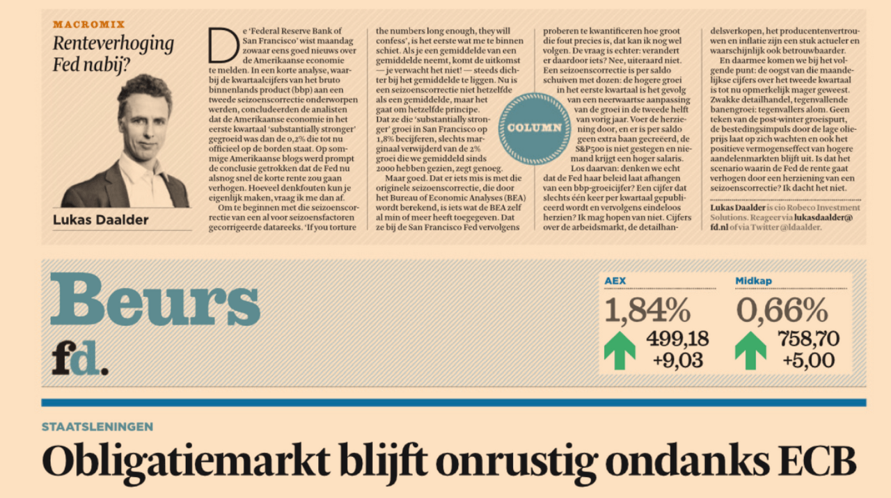 De Federal Reserve Bank of San Francisco wist deze maandag zowaar eens goed nieuws over de Amerikaanse economie te melden. In een korte analyse, waarbij de kwartaalcijfers van het Bruto Binnenlands Product (BBP) aan een tweede seizoencorrectie onderworpen werden, concludeerden de analisten dat de Amerikaanse economie in het eerste kwartaal ‘substantially stronger’ gegroeid was dan de 0,2% die tot nu officieel op de borden staat. Op sommige Amerikaanse blogs werd prompt de conclusie getrokken dat de Fed nu alsnog snel de korte rente zou gaan verhogen. Hoeveel denkfouten kun je eigenlijk maken, vraag ik me dan af.