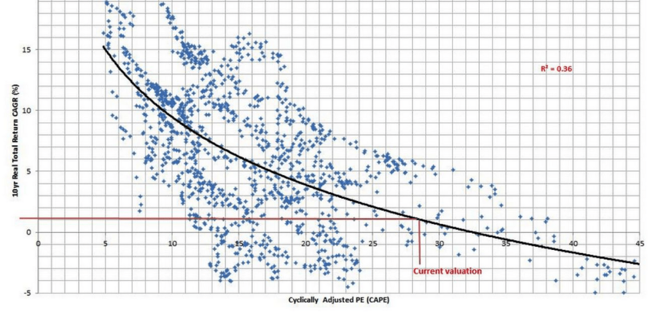 Om met een compliment te beginnen: ik vind het een mooie grafiek. Een puntenwolk, een raster, een duidelijke zwarte lijn en dan die vervaarlijk uitziende rode lijn. De boodschap: afgaande op het verleden, gaan Amerikaanse beleggers slechts 1% rendement maken de komende tien jaar. Simpel, maar doeltreffend.