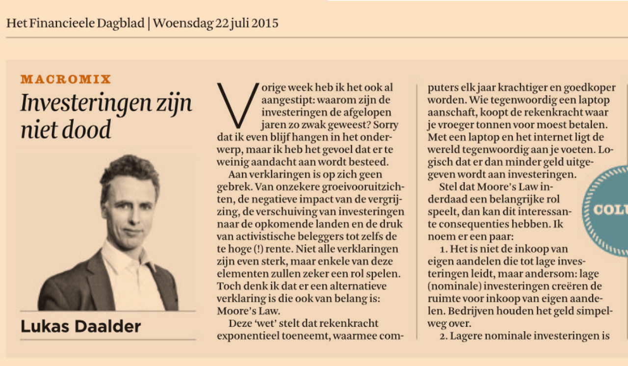 Aan verklaringen voor dit fenomeen is op zich geen gebrek. Van onzekere groeivooruitzichten, de negatieve impact van vergrijzing, de verschuiving van investeringen naar de opkomende landen, de druk van activistische beleggers tot zelfs de te hoge rente(!). Hoewel ik niet al de verklaringen even sterk vind, geloof ik zonder meer dat enkele van deze elementen een rol hebben gespeeld. Toch denk ik dat er een alternatieve verklaring is die ook een belangrijke rol gespeeld heeft: Moore’s law.