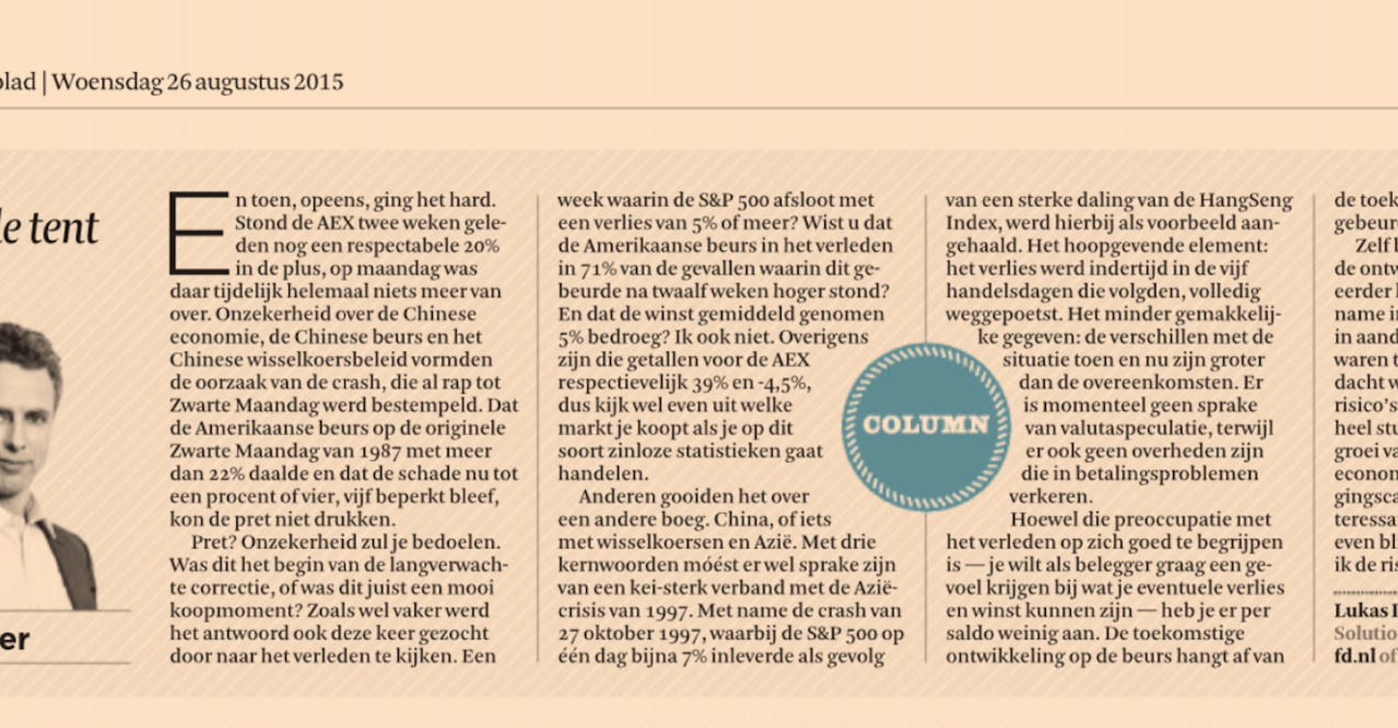 En toen, opeens, ging het hard. Stond de AEX twee weken geleden nog een respectabele 20% in de plus, op maandag was daar tijdelijk helemaal niets meer van over. Onzekerheid over de Chinese economie, de Chinese beurs en het Chinese wisselkoersbeleid vormden de oorzaak van de crash, die al rap tot Zwarte Maandag werd bestempeld. Dat de Amerikaanse beurs op de originele Zwarte Maandag van 1987 met meer dan 22% daalde en dat de schade nu tot een procent of vier, vijf beperkt bleef, kon de pret niet drukken.