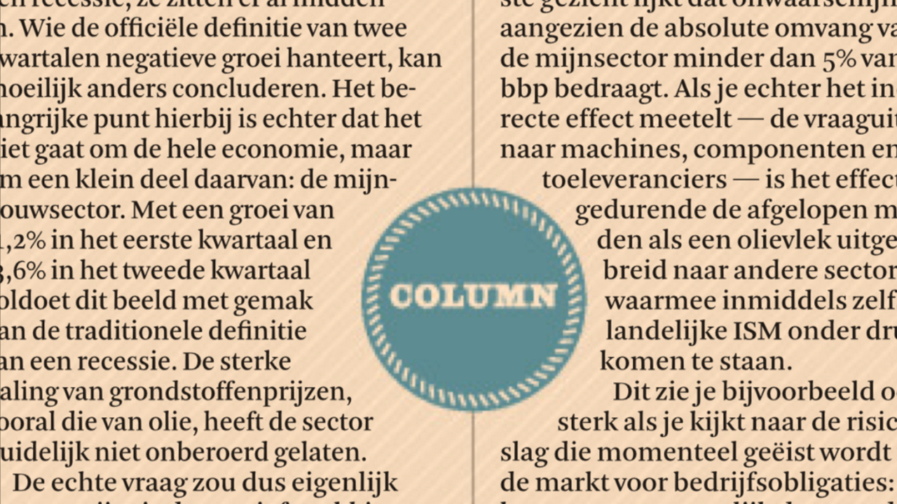 En toch is het antwoord op die eerste vraag simpeler dan het lijkt. Amerika staat niet aan de vooravond van een recessie, het zit er al midden in. Wie de officiële definitie van twee kwartalen negatieve groei hanteert, kan moeilijk anders concluderen. Het belangrijke punt hierbij echter is dat het niet gaat om de hele economie, maar om een klein deel daarvan: de mijnbouwsector. Met een negatieve groei van 1,2% in het eerste kwartaal en 3,6% in het tweede kwartaal voldoet deze sector met gemak aan de traditionele definitie van een recessie. De sterke daling van grondstoffenprijzen en dan vooral die van olie, heeft de sector duidelijk niet onberoerd gelaten.