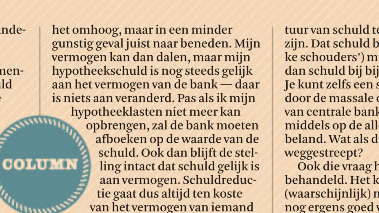 Kennelijk wel. En aan de reacties kan ik ook zien waar het voor veel mensen misging. Schuld is vermogen, maar dat betekent niet dat het omgekeerde –vermogen is schuld- ook waar is. Als ik bijvoorbeeld een huis met een hypotheek koop, ligt mijn schuld vanaf dat moment vast, terwijl mijn vermogen vrij kan bewegen. In het gunstige geval gaat het omhoog, maar in het minder gunstige geval juist naar beneden. Míjn vermogen kan dan dalen, maar mijn hypotheekschuld is nog steeds gelijk aan het vermogen van de bank, daar is niets aan veranderd. Nou kan je zeggen dat de bank ook de waarde van de schuld zou variëren, maar zelfs al zou dat wel zo zijn, dan blijft de stelling dat schuld gelijk aan vermogen is intact. Schuldreductie gaat dus altijd ten koste van het vermogen van iemand anders. Een gratis lunch bestaat niet.