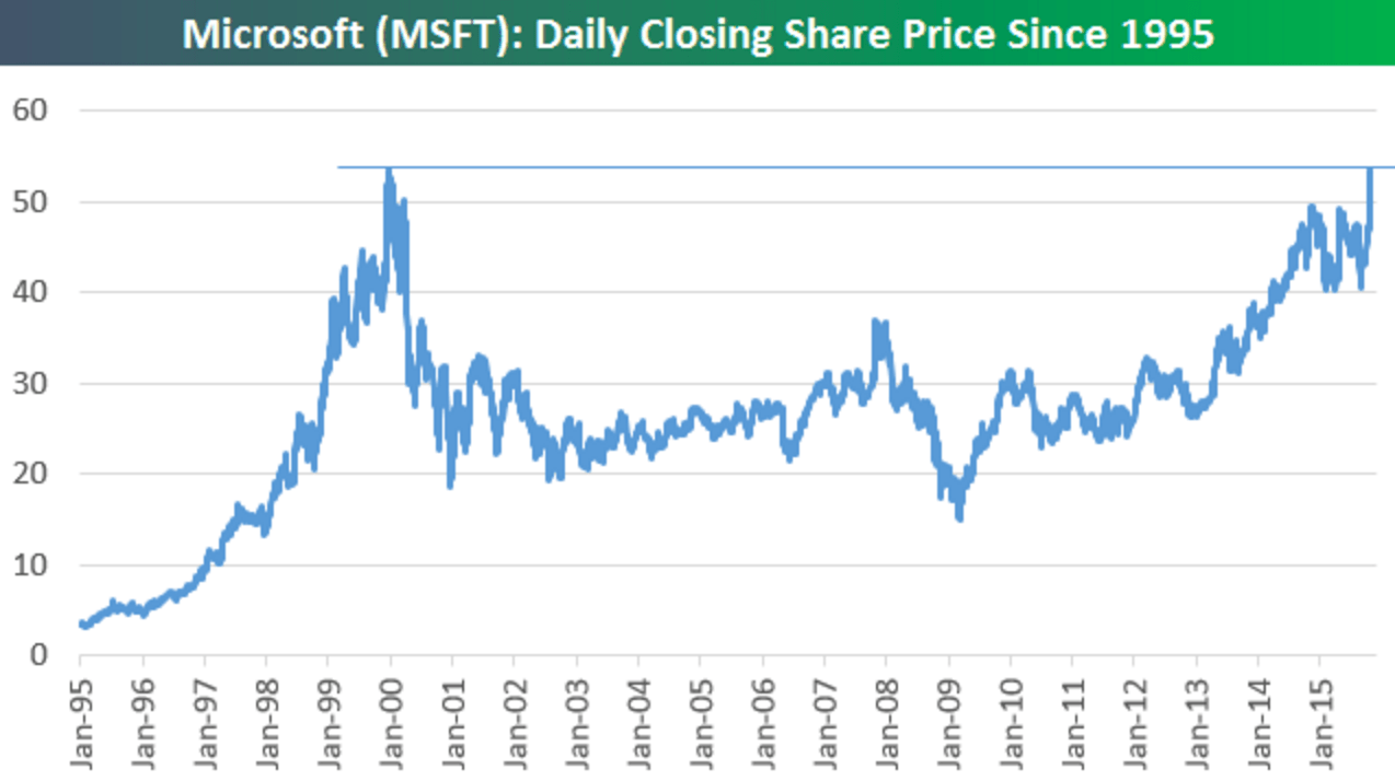 Bijna is het zover. Na ruim vijftien jaar heeft het aandeel Microsoft dan toch eindelijk het Y2K effect en de internetbubbel weten weg te werken.