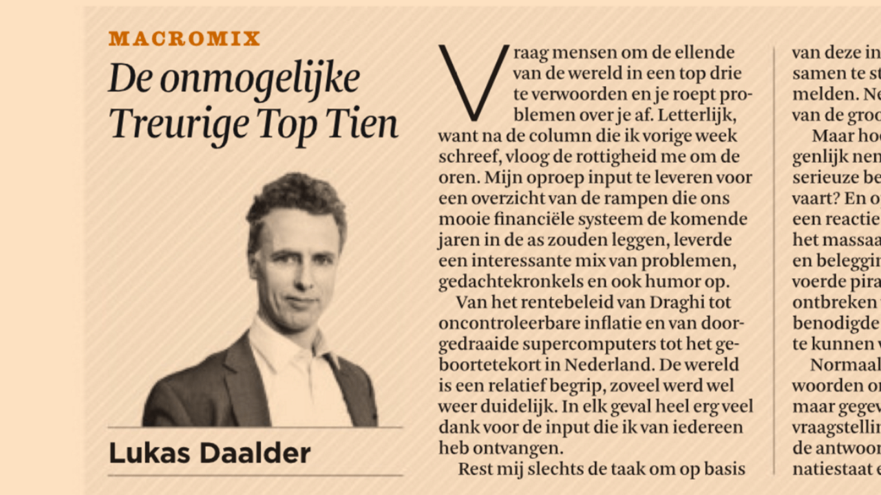 Vraag mensen om de ellende van de wereld in een top drie te verwoorden en je roept problemen over je af. Letterlijk, want na de column die ik vorige week schreef, vloog de rottigheid me om de oren. Mijn oproep input te leveren aan een overzicht van de rampen die ons mooie financiële systeem de komende jaren in de as zouden gaan leggen, leverde een interessante mix van problemen, gedachtenkronkels en ook humor op. Van het rentebeleid van Draghi tot oncontroleerbare inflatie en van doorgedraaide supercomputers tot het geboortetekort in Nederland. De wereld is een relatief begrip, zoveel werd wel weer duidelijk. In elk geval heel erg veel dank voor de input die ik van iedereen heb ontvangen.