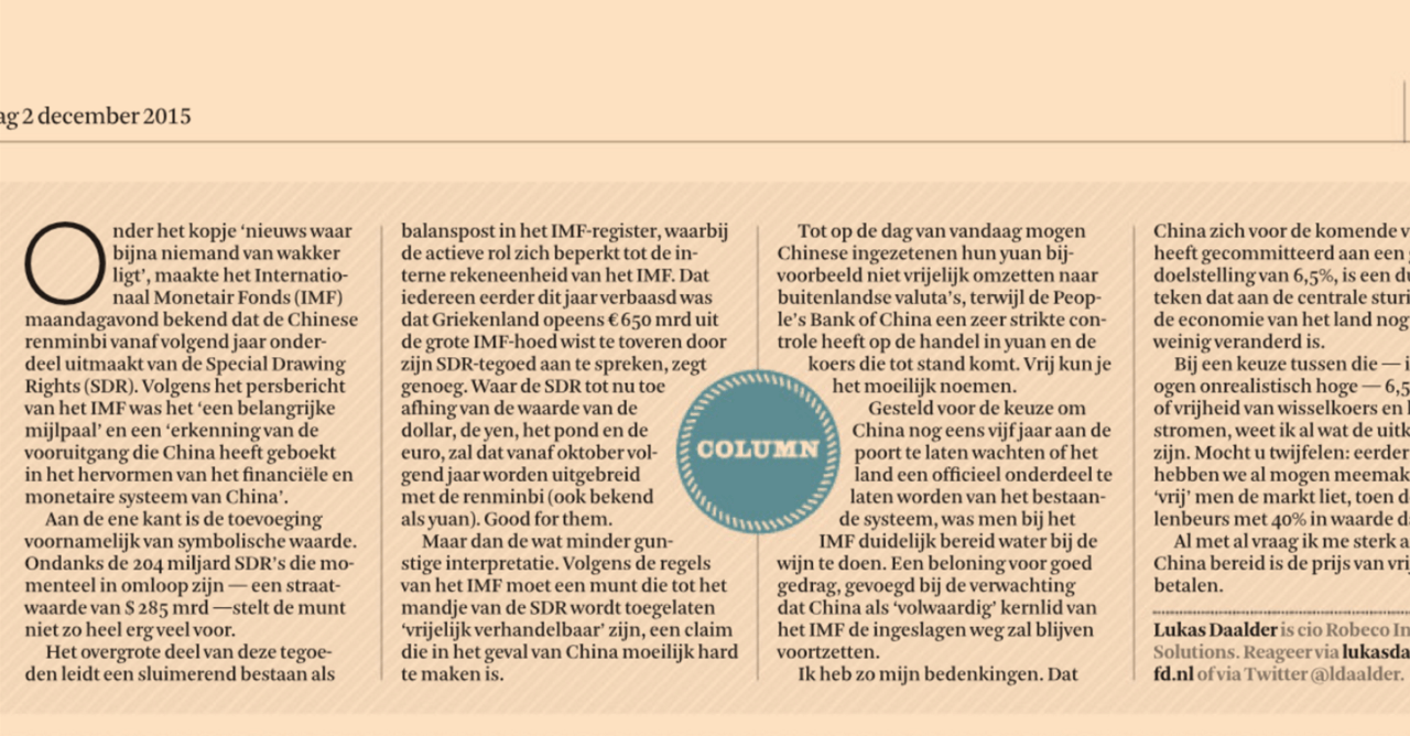 Onder het kopje Nieuws Waar Bijna Niemand van Wakker ligt, maakte het IMF maandagavond bekend dat de Chinese yuan vanaf volgend jaar onderdeel uitmaakt van de Special Drawing Rights (SDR). Volgens het persbericht van het IMF was het ‘een belangrijke mijlpaal’ en een ‘erkenning van de vooruitgang die China heeft geboekt in het hervormen van het financiële en monetaire systeem van China’.