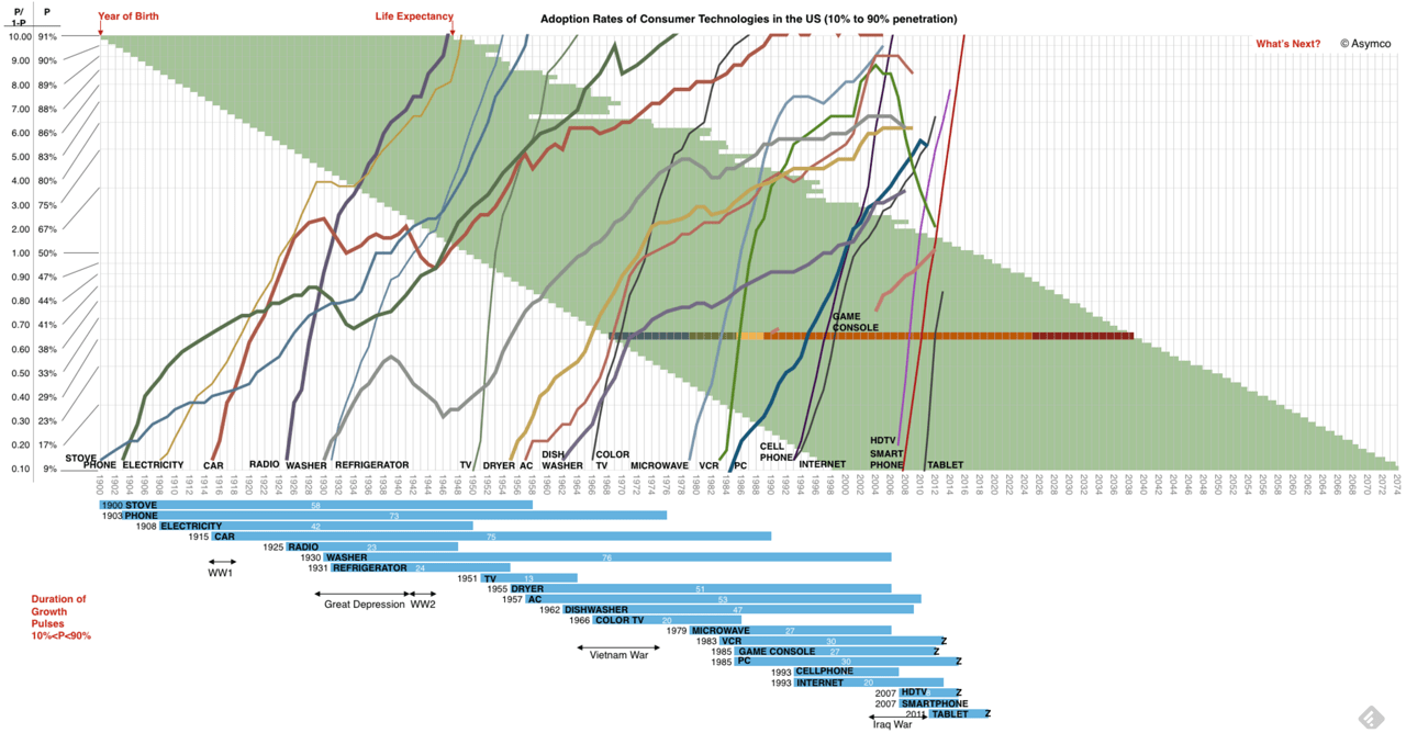 The horizontal axis is then a time-line from 1900 to 2074. The trend lines indicate for each product when it reaches 10% adoption rate and how long it then takes to rise to 90%. Automobiles for example (orange-brown line) broke the 10% adoption rate in 1915 and then took 75 years to reach an adoption level of 90%. In the case of cars, you also clearly see a reversal during the Great Depression (decline from 1929) and the Second World War (1940), a dip you don’t see reflected at all in radio adoption rates. The radio is shown by the thick purple line, which took just 23 years to rise from 10% in 1925 to 90%.