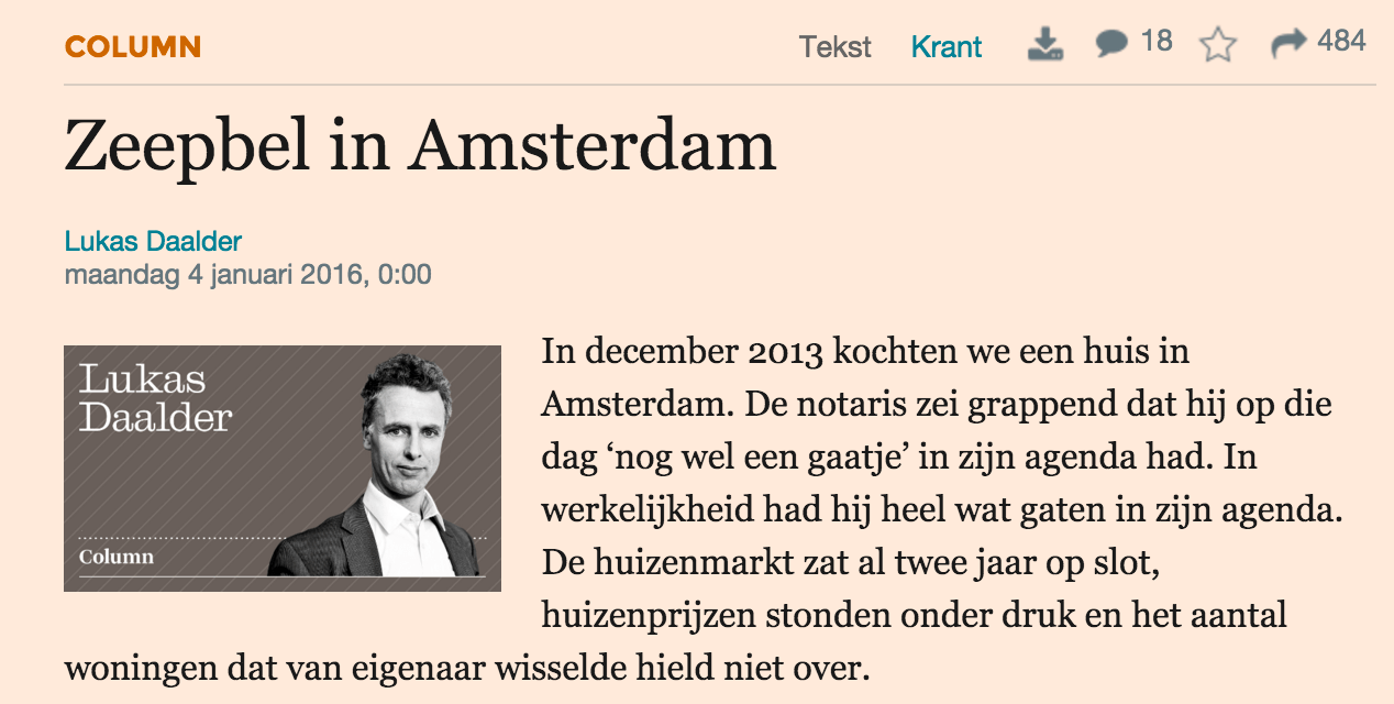 Is het een zeepbel? UBS –in mijn ogen een kundige partij op het gebied van vastgoedwaardering- plaatste Amsterdam onlangs op de zesde plaats van de lijst wereldwijde steden met overspannen woningmarkten. De lonen zijn de afgelopen jaren nauwelijks gestegen en dat staat op gespannen voet met de stijgende lasten die met de aankoop van een Amsterdams huis gemoeid zijn. Gevoegd bij de anekdotes van huizen die op de eerste dag al boven de vraagprijs verkocht worden, lijkt het antwoord volmondig ja. Coen Teulings daarentegen beantwoordde de vraag een maand geleden in het NRC echter met een duidelijk ‘nee’. Het beperkte aanbod van Amsterdamse koophuizen, de aantrekkelijkheid van steden in het algemeen en de lage rentestanden die er toe geleid hebben dat huizen gezien kunnen worden als een beter alternatief dan sparen: wat er nu gebeurt is allemaal goed te verklaren. Meer vraag dan aanbod, simpel.