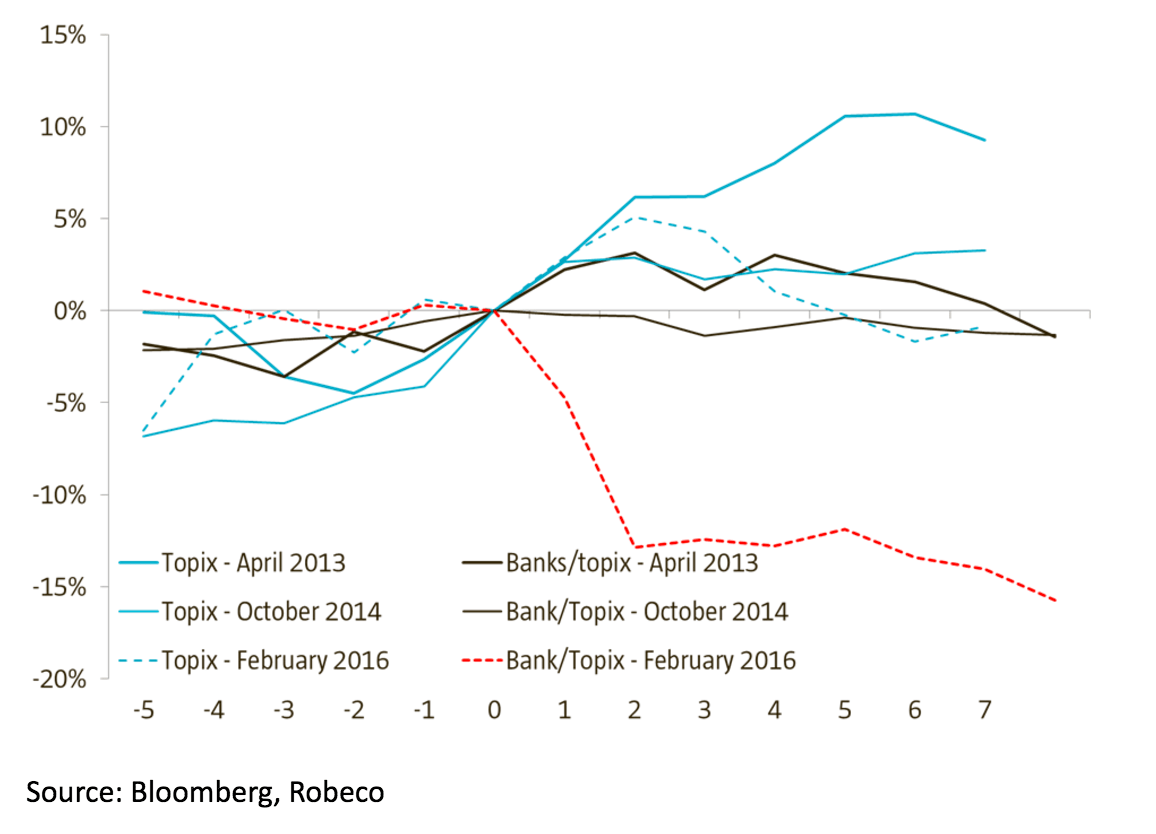 When the Japanese central bank took both friend and foe by surprise at the end of January with its introduction of negative deposit rates, this initially had the desired effect: the Japanese yen weakened and equity markets rallied. However, there was one clear signal to suggest that it would turn out very differently this time. Whereas equity markets reacted positively in general terms, a part of the market showed a very different response: the Japanese banks. With the Nikkei 5% higher just two days after the interest-rate decision, the TOPIX bank index lost 8.5% over the same period. The reason? Fears about the profitability of banks in a negative interest-rate environment. The negative deposit rates mean that from now on commercial banks have to pay interest to the central bank on their credit balance. Partly due to this development – not to mention concerns over Chinese growth, oil markets and the US recession – sentiment turned and Japanese equities subsequently plummeted 15% in two weeks that followed. If the plan of the Bank of Japan was to stimulate the Japanese banking sector to pump idle capital into the economy, then we can safely say that this was not the most effective way of doing it.