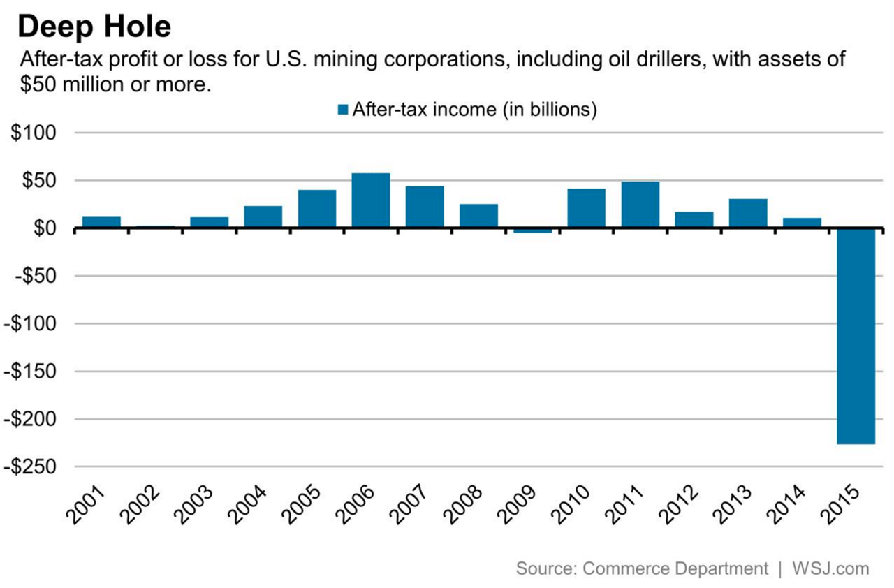 While it was still lucrative to extract oil from the ground at 100 dollars, once it had broken below the 60-dollar mark, the party was well and truly over. In late 2015, the price of a barrel of oil was 40 dollars, with losses being suffered as a result. Huge losses, as the graph makes clear. The mining sector reported cumulative losses of 227 billion dollars for the year 2015. These losses are as big as all the profits in the previous eight years added together. To put that into a bit more perspective: that is roughly a quarter of the size of the economy of the Netherlands. It’s not as big as the amounts we saw during the banking crisis in 2008, but it’s impressive enough.